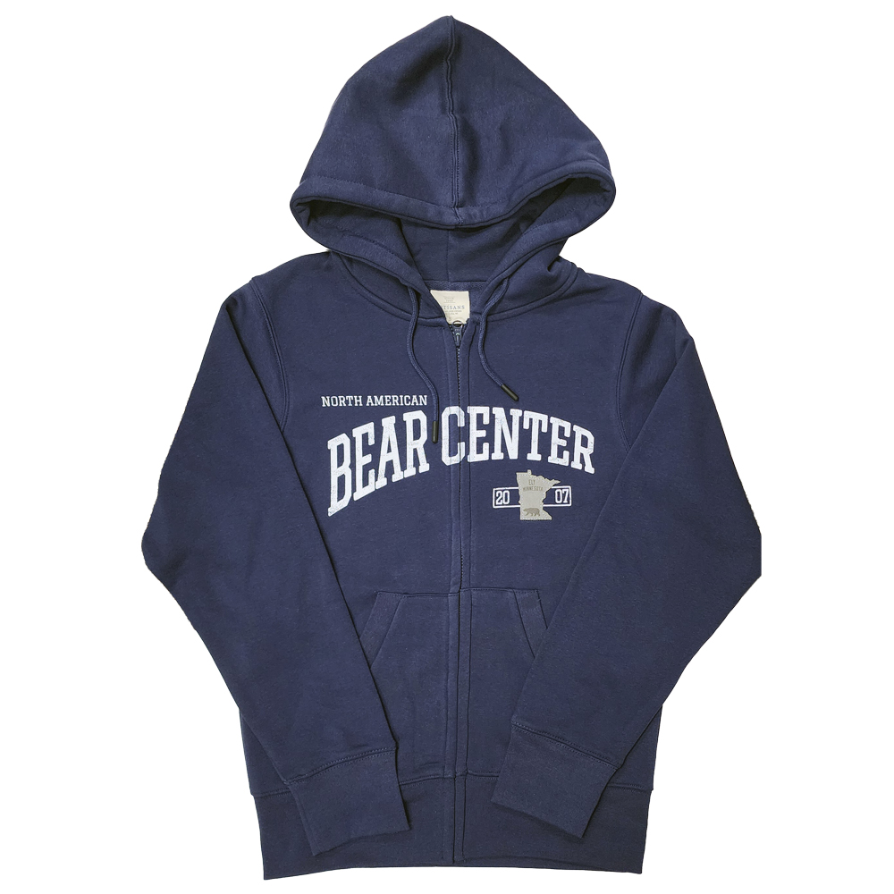 Get ready to cozy up in style with our full-zip navy hoodie! Crafted from a blend of 65% cotton and 35% polyester, this hoodie is perfect for any adventure. Show off your love for wildlife with “North American Bear Center” boldly screen printed across the front. Plus, it features a cool Minnesota patch proudly displaying “Ely, MN” and our establishment year, 2007.