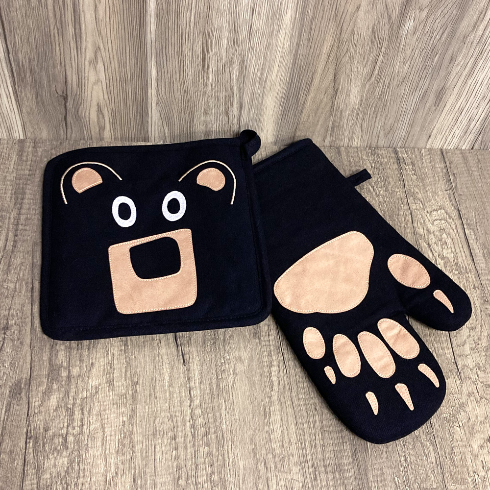 Add some fun to the kitchen with our Black Bear pot holder and oven mitt pack. This pack features an oven mitt with a fun bear paw applique while the pot holder has a cute bear face applique. Made of 100% woven cotton and fill. Loop for easy hanging.