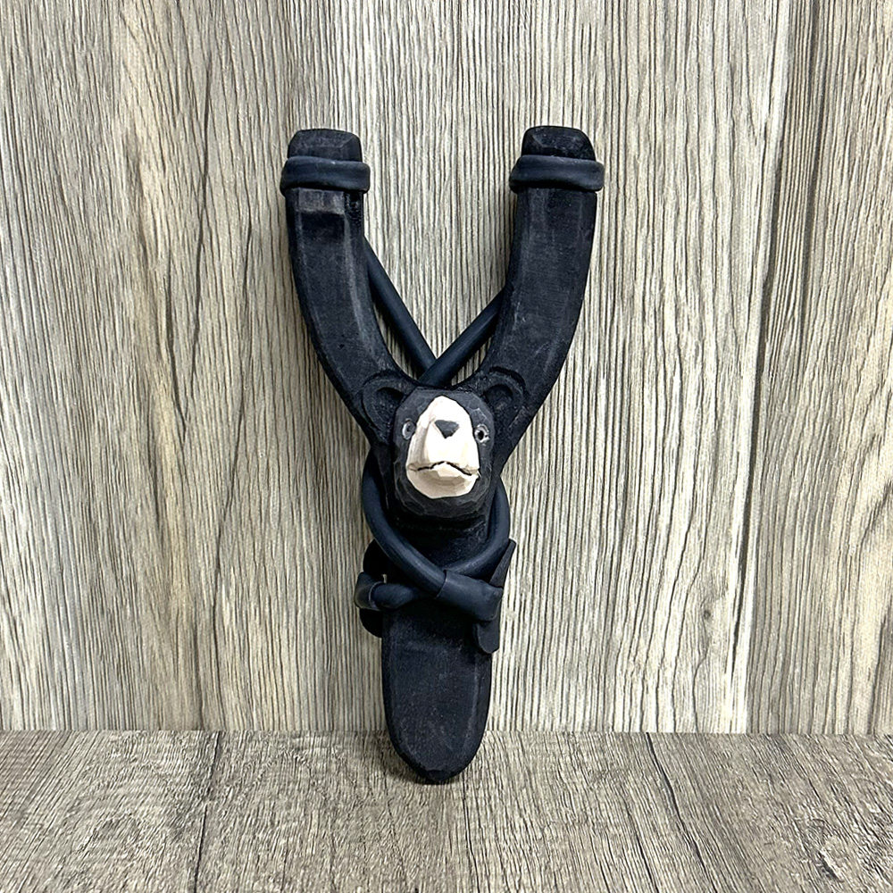 These unique, handmade black bear wooden slingshots are a must-have! Each 8–10 inch slingshot is meticulously carved from forked tree branches, finished with a striking black acrylic paint that ensures durability. Equipped with natural latex bands and a genuine leather pouch.