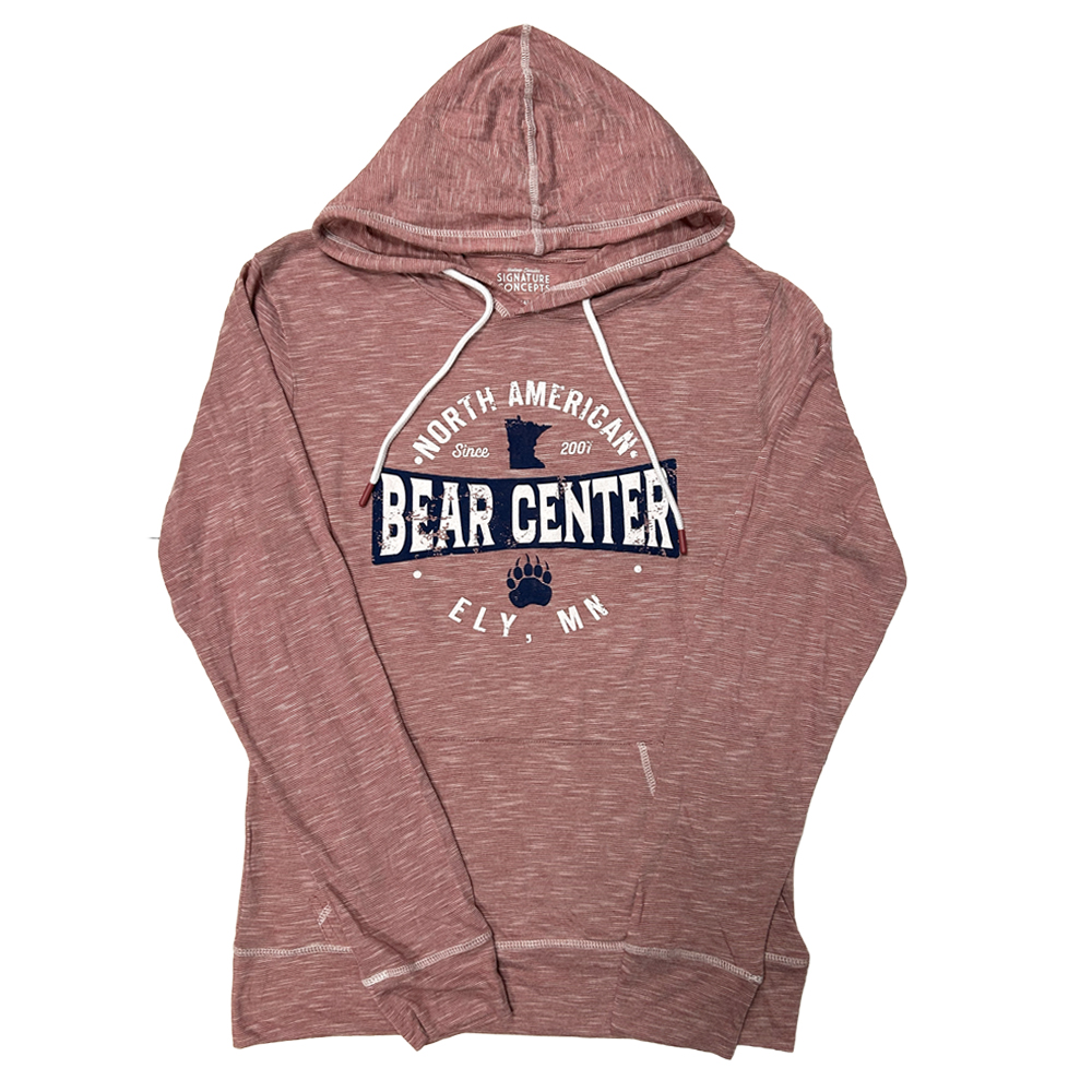 This lightweight brick red colored hooded long sleeve t-shirt has a soft cotton feel. North American Bear Center is screen-printed on the front. Comes with a kangaroo pocket and drawstring with plastic tip. Made out of 75% polyester and 25% cotton heather knit.