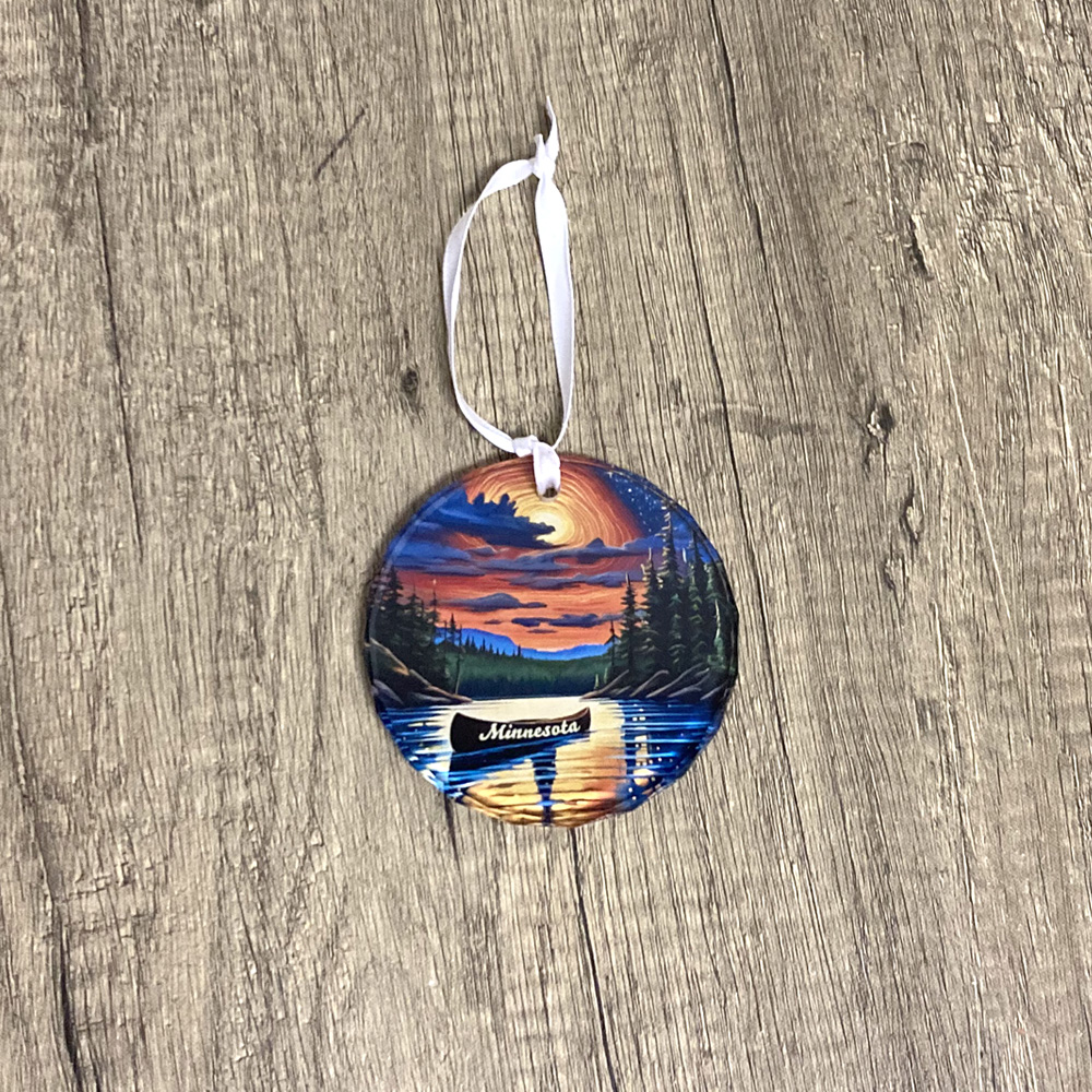 3″ round glass ornament. This ornament features a stunning canoe scene and Minnesota namedropped. Fade-resistant and crafted from premium glass. This ornament reflects light beautifully, adding a touch of nature to any holiday or home décor. Packaged in a sleek, protective gift box, it’s ready for gifting.