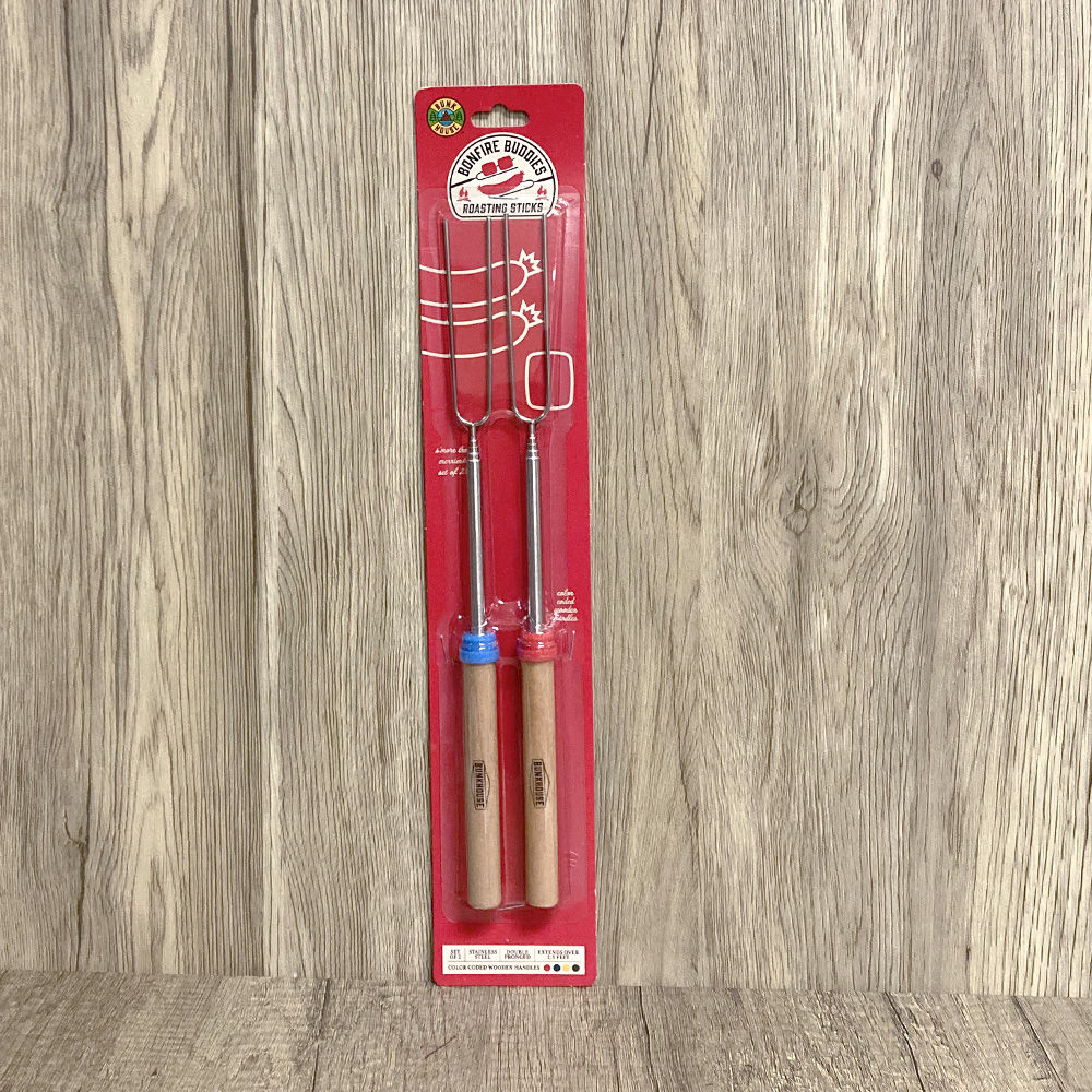 Create great memories with these campfire roasters! This pair of double pronged campfire roasters are made with stainless steel and fully extend over 2.5 feet. Wooden handles help you so you can toast comfortably around the fire. Makes for a great gift!