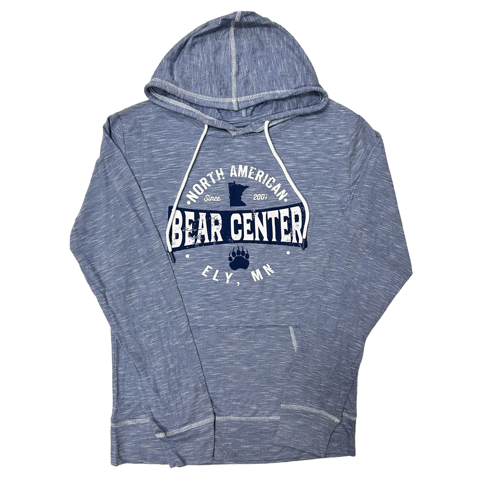 This lightweight royal blue colored hooded long sleeve t-shirt has a soft cotton feel. North American Bear Center is screen-printed on the front. Comes with a kangaroo pocket and drawstring with plastic tip. Made out of 75% polyester and 25% cotton heather knit.